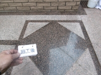 石材用の専用クリーナーを数種類使い洗浄後、取り切れなかった汚れをシミ抜き剤で汚れ除去 元の色味を戻した御影石床